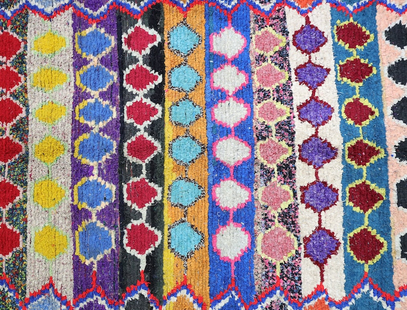 Azilal rugs boast abstract, painterly designs reminiscent of rugs from Ourika. What sets them apart is a vibrant color palette, achieved through the incorporation of cotton alongside wool..