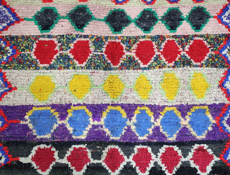 An unparalleled vintage masterpiece, carefully crafted by Berber Tribes in the Boucherouite style using Upcycled Wool textiles.