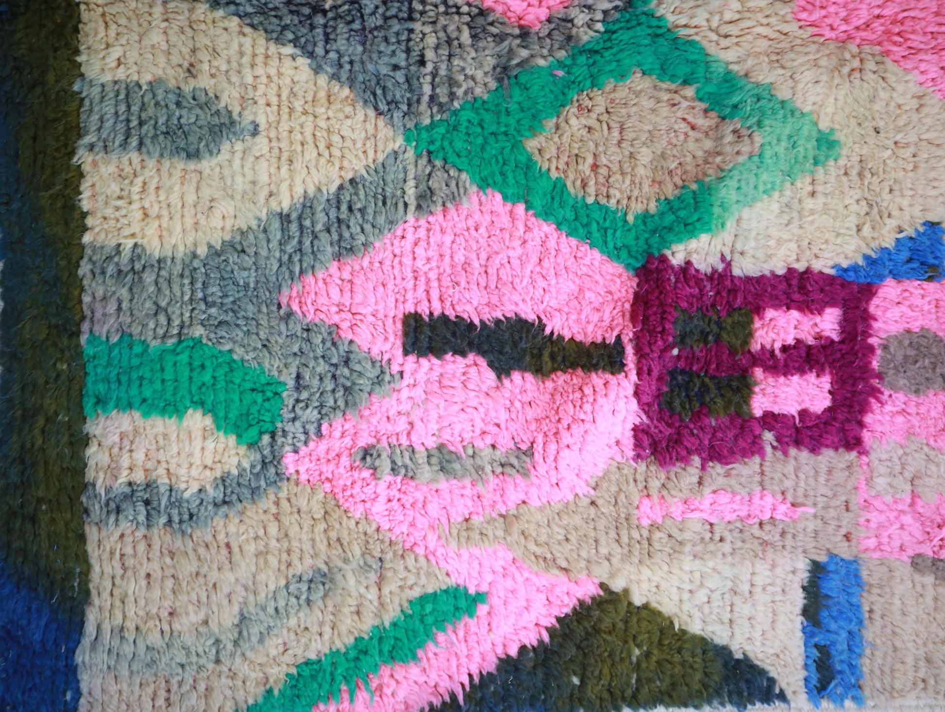 Originating in the Holy town of Boujad, these rugs, woven by diverse tribes, exhibit a wide spectrum of color, composition, and weave. Described as surreal, mystic, and mesmerizing, Boujad rugs transport us to a world beyond reality. Their construction, with twice as many horizontal as vertical knots, renders them floppy and easy to move.
