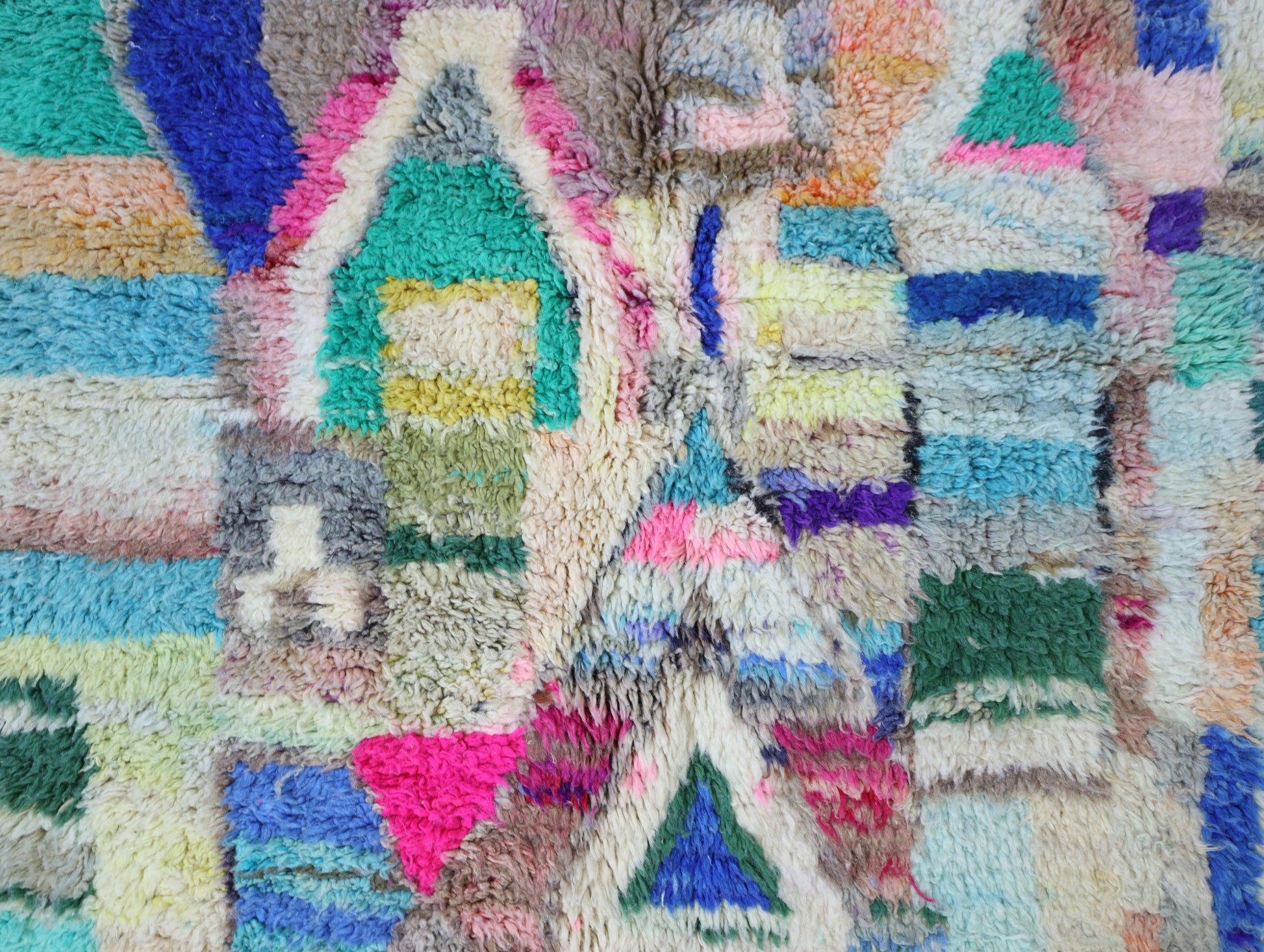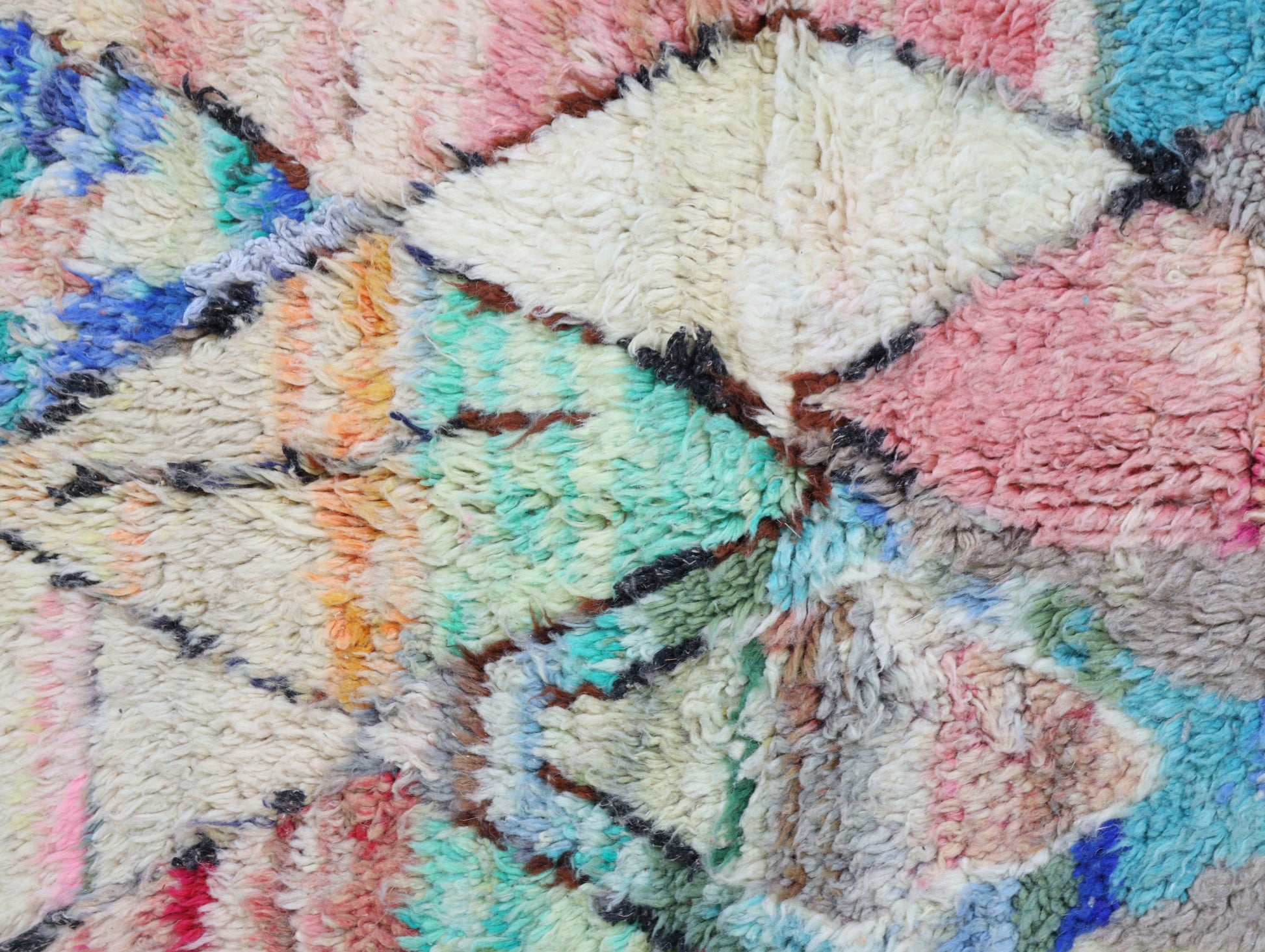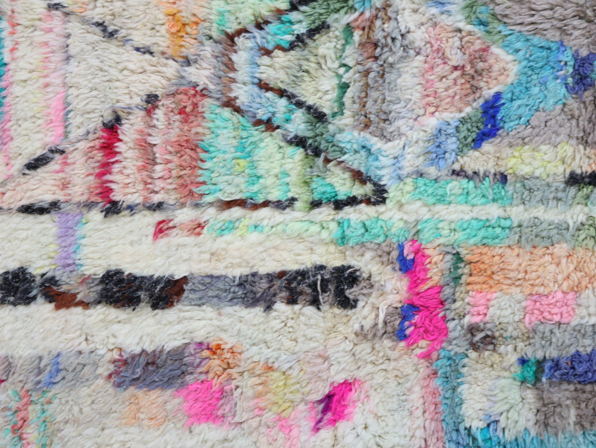 Originating in the Holy town of Boujad, these rugs, woven by diverse tribes, exhibit a wide spectrum of color, composition, and weave. Described as surreal, mystic, and mesmerizing, Boujad rugs transport us to a world beyond reality. Their construction, with twice as many horizontal as vertical knots, renders them floppy and easy to move.