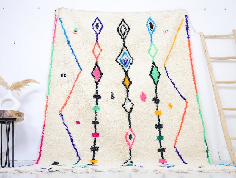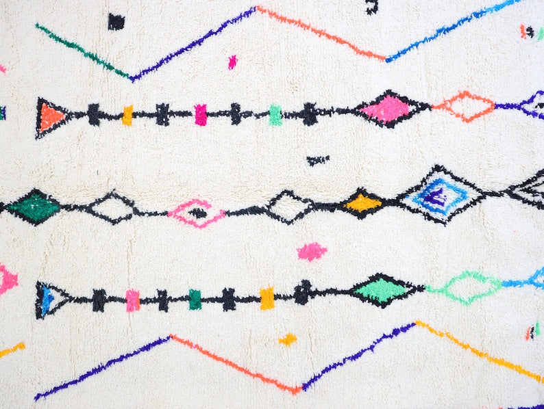 Azilal rugs boast abstract, painterly designs reminiscent of rugs from Ourika. What sets them apart is a vibrant color palette, achieved through the incorporation of cotton alongside wool.