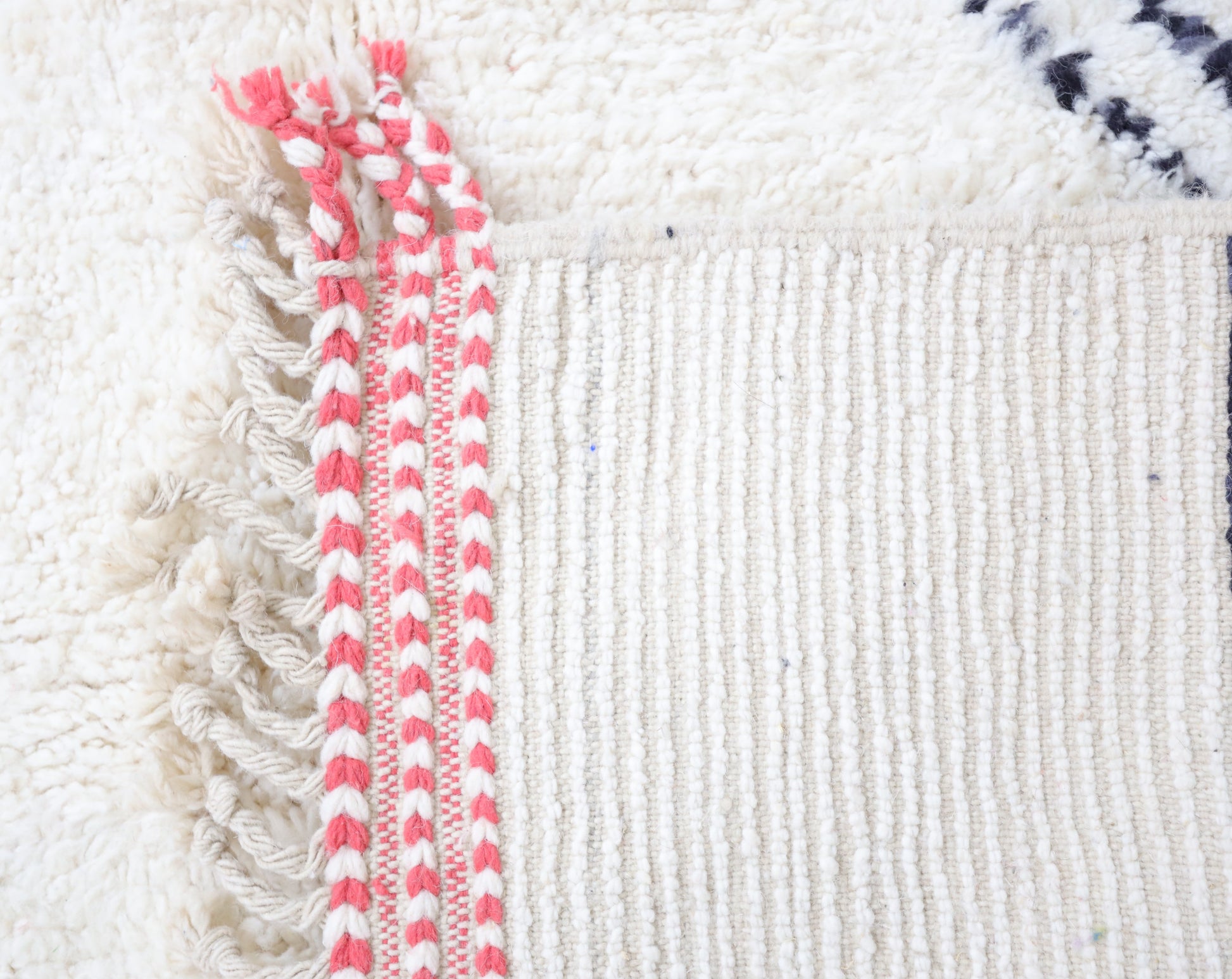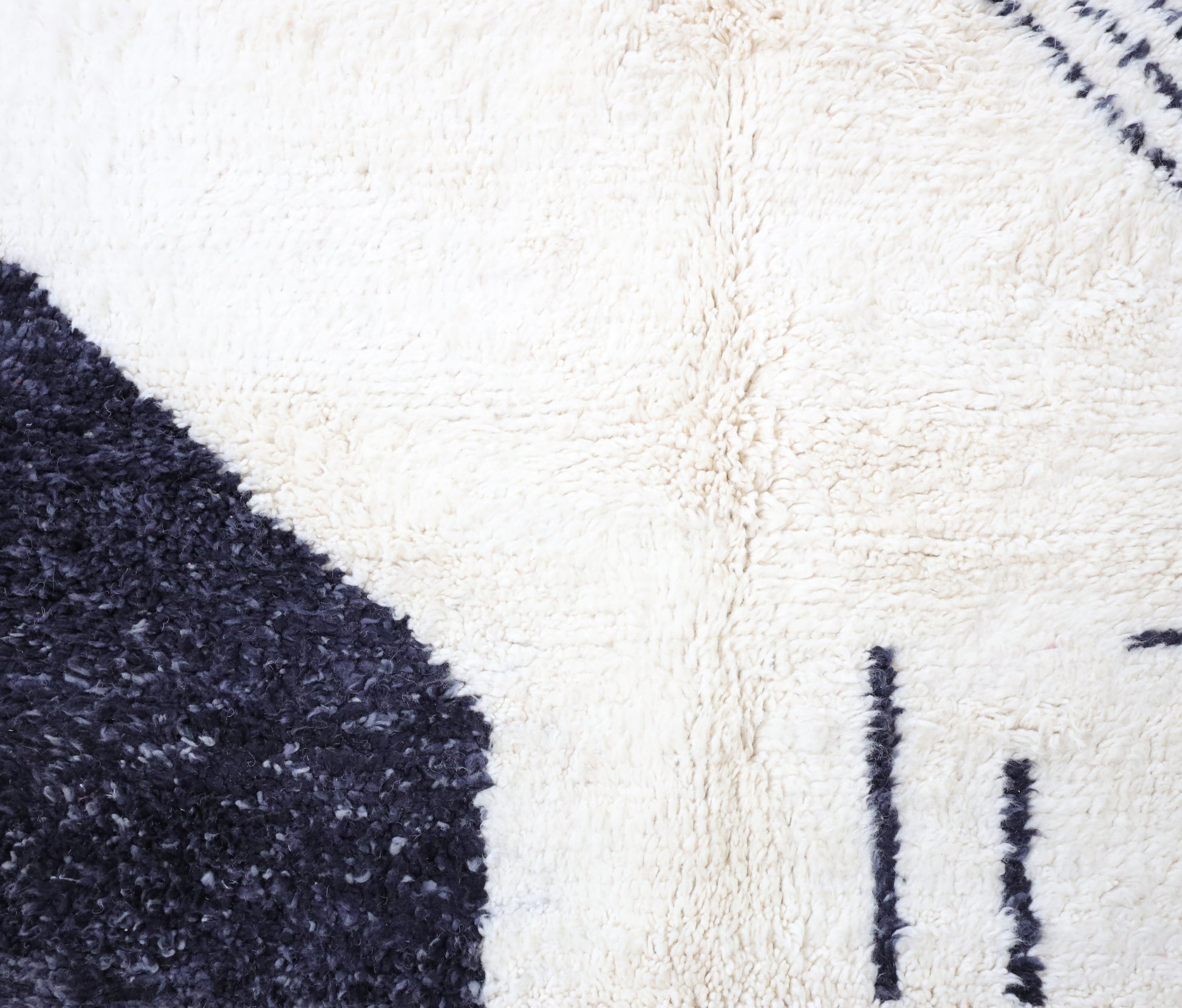 Wool, a sacred material for the Amazigh (Berber) people, forms the cornerstone of Moroccan rug design. Durable, long-lasting, and soft underfoot, wool is both functional and comfortable. In this piece, the wool pile is expertly knotted onto a wool foundation, adding substance and allowing it to gracefully embrace the floor.
