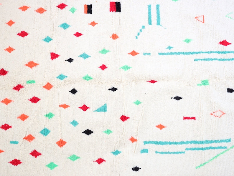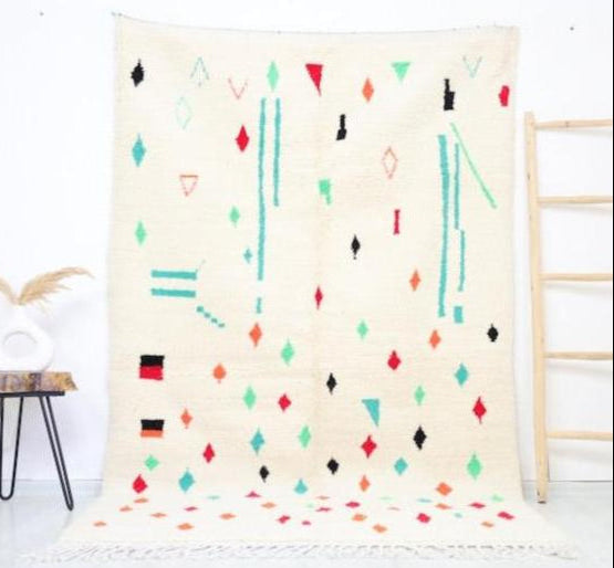 Azilal rugs boast abstract, painterly designs reminiscent of rugs from Ourika. What sets them apart is a vibrant color palette, achieved through the incorporation of cotton alongside wool.