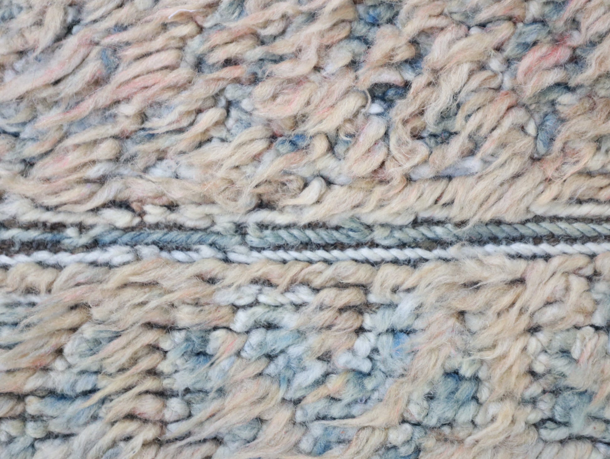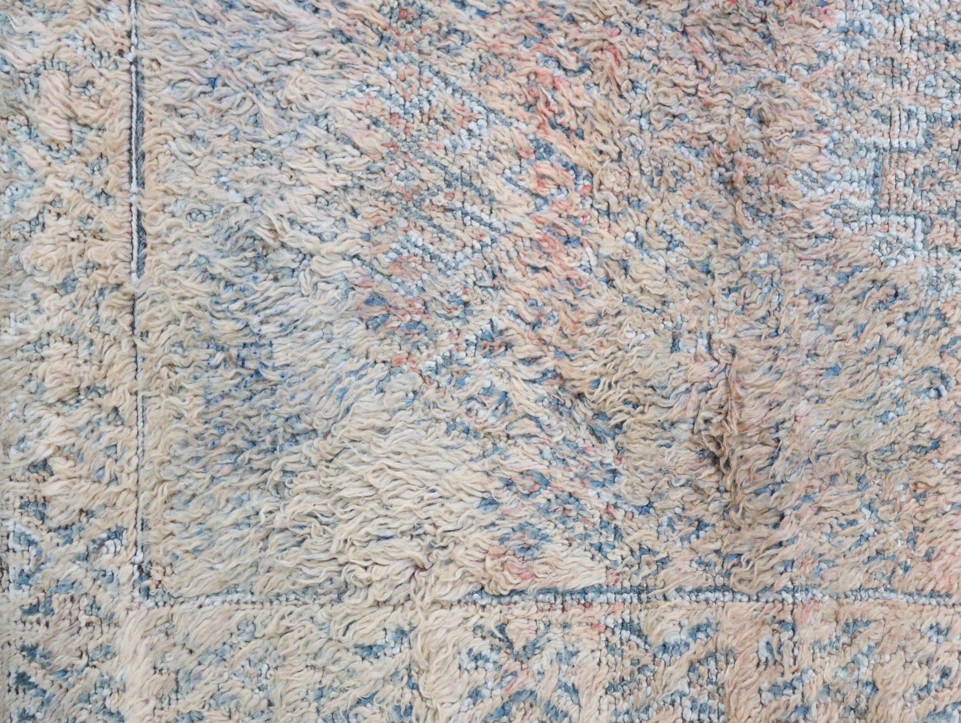 Wool, a sacred material for the Amazigh (Berber) people, forms the cornerstone of Moroccan rug design. Durable, long-lasting, and soft underfoot, wool is both functional and comfortable. In this piece, the wool pile is expertly knotted onto a wool foundation, adding substance and allowing it to gracefully embrace the floor.