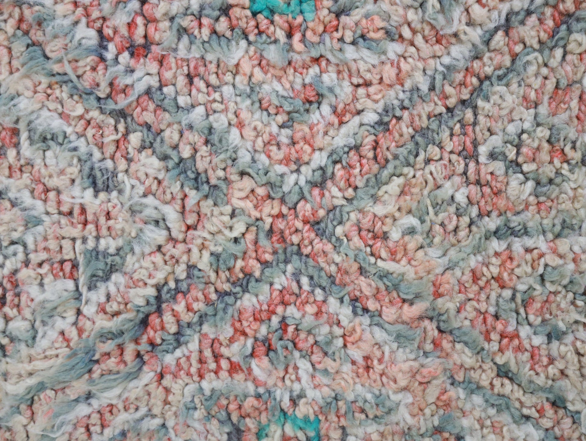 Originating in the Holy town of Boujad, these rugs, woven by diverse tribes, exhibit a wide spectrum of color, composition, and weave. Described as surreal, mystic, and mesmerizing, Boujad rugs transport us to a world beyond reality. Their construction, with twice as many horizontal as vertical knots, renders them floppy and easy to move.