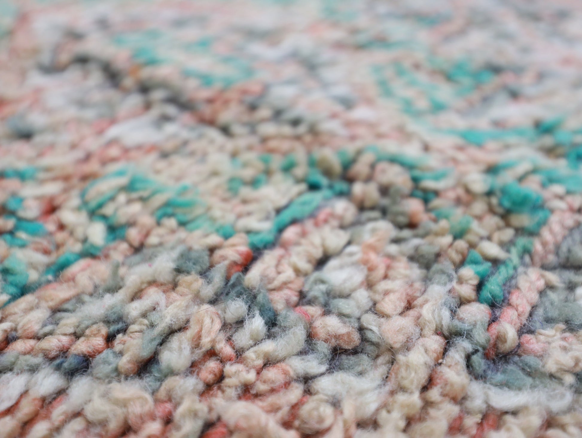 Wool, a sacred material for the Amazigh (Berber) people, forms the cornerstone of Moroccan rug design. Durable, long-lasting, and soft underfoot, wool is both functional and comfortable. In this piece, the wool pile is expertly knotted onto a wool foundation, adding substance and allowing it to gracefully embrace the floor.