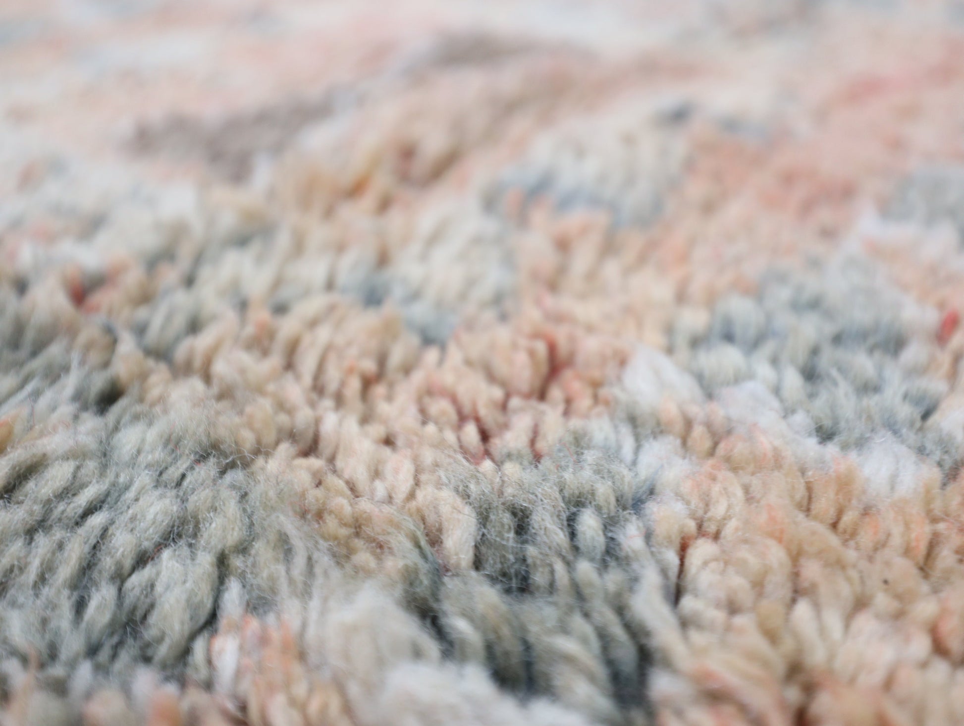 Wool, a sacred material for the Amazigh (Berber) people, forms the cornerstone of Moroccan rug design. Durable, long-lasting, and soft underfoot, wool is both functional and comfortable. In this piece, the wool pile is expertly knotted onto a wool foundation, adding substance and allowing it to gracefully embrace the floor.