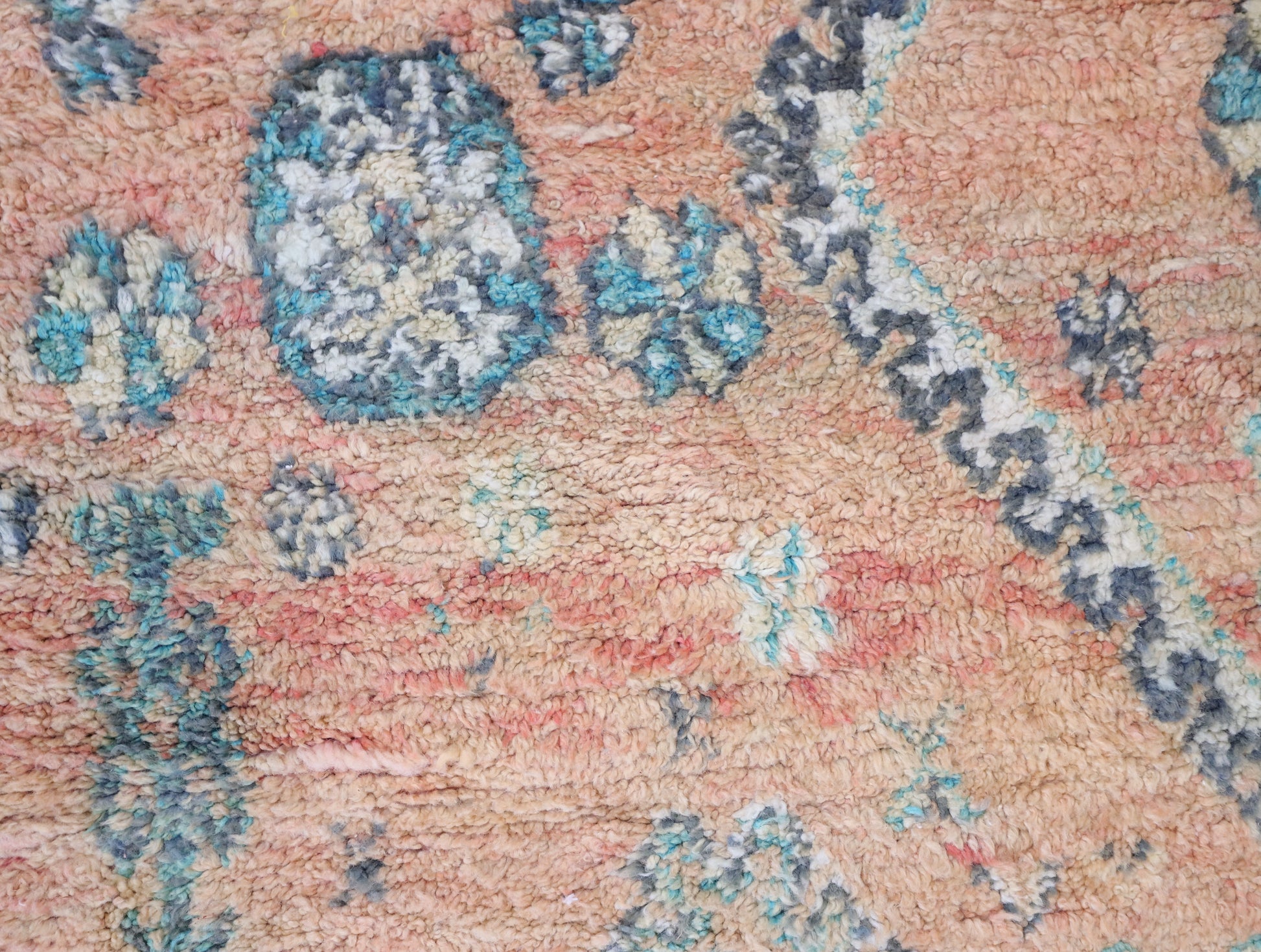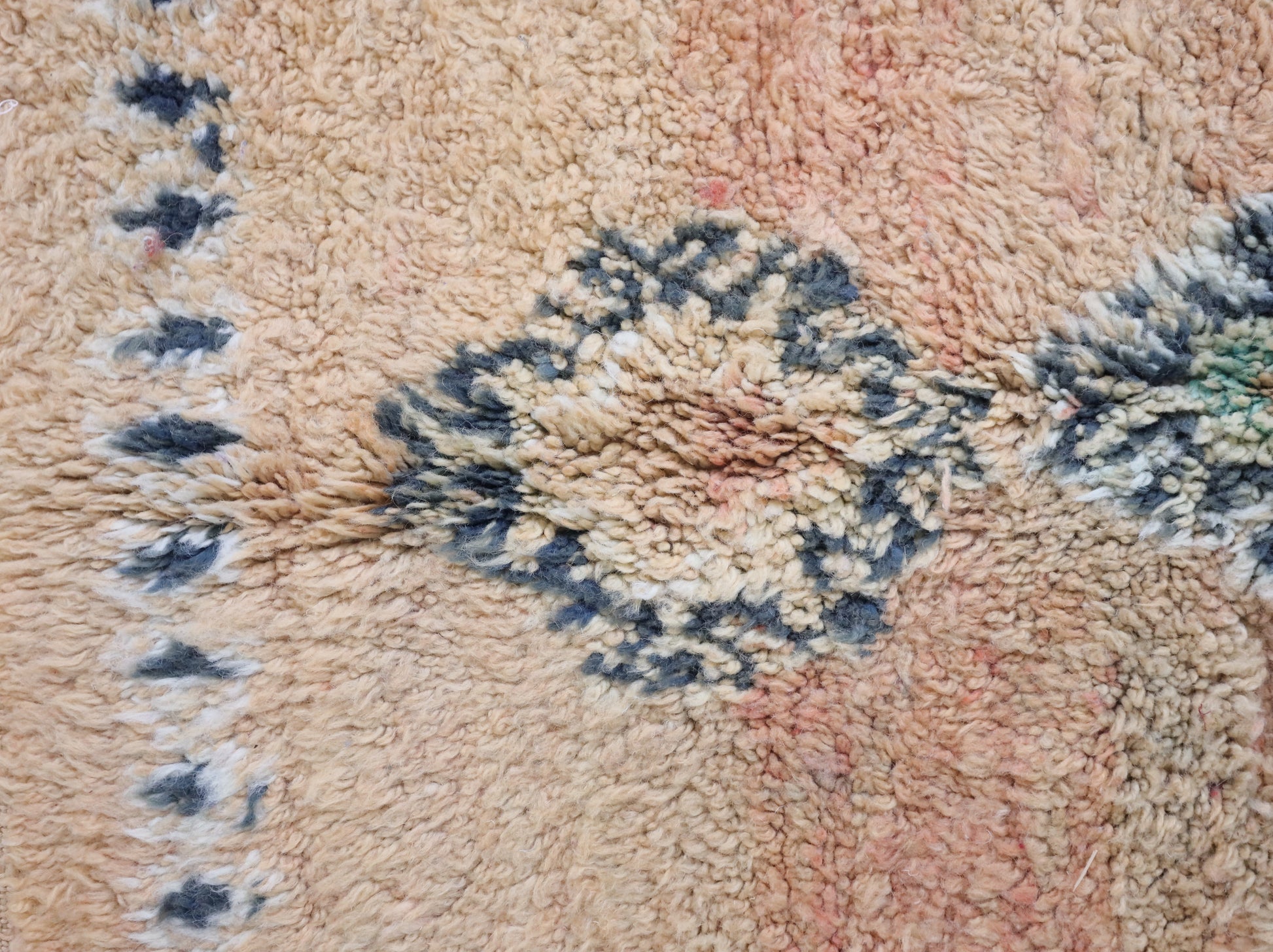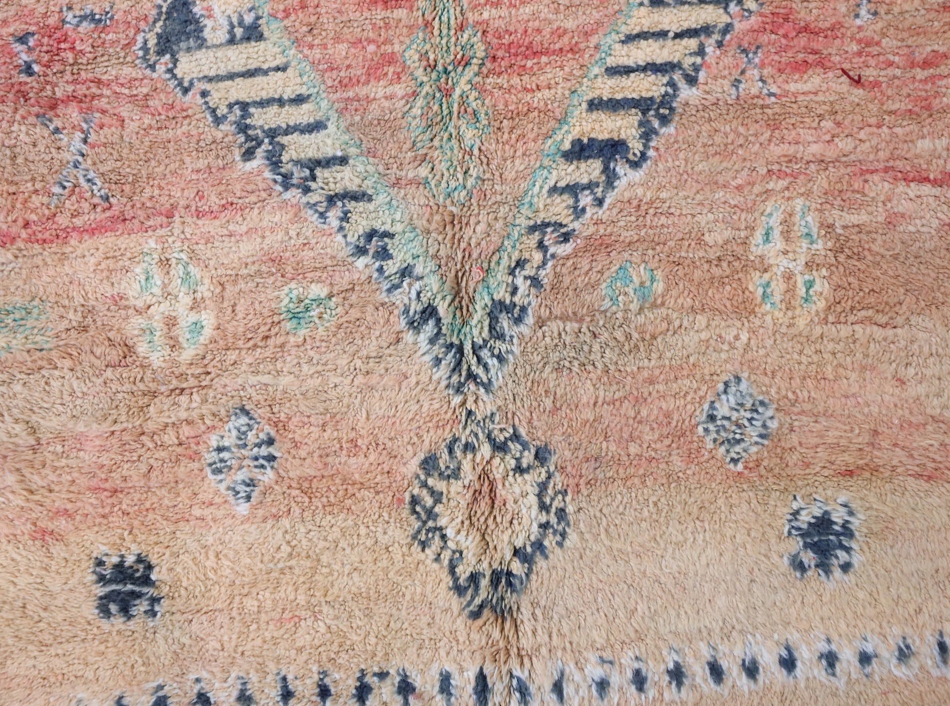 Wool, a sacred material for the Amazigh (Berber) people, forms the cornerstone of Moroccan rug design. Durable, long-lasting, and soft underfoot, wool is both functional and comfortable. In this piece, the wool pile is expertly knotted onto a wool foundation, adding substance and allowing it to gracefully embrace the floor.