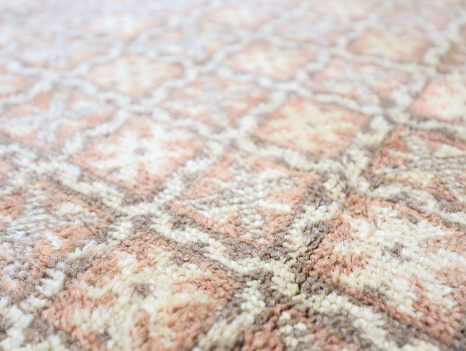 Wool, a sacred material for the Amazigh (Berber) people, forms the cornerstone of Moroccan rug design. Durable, long-lasting, and soft underfoot, wool is both functional and comfortable. In this piece, the wool pile is expertly knotted onto a wool foundation, adding substance and allowing it to gracefully embrace the floor.