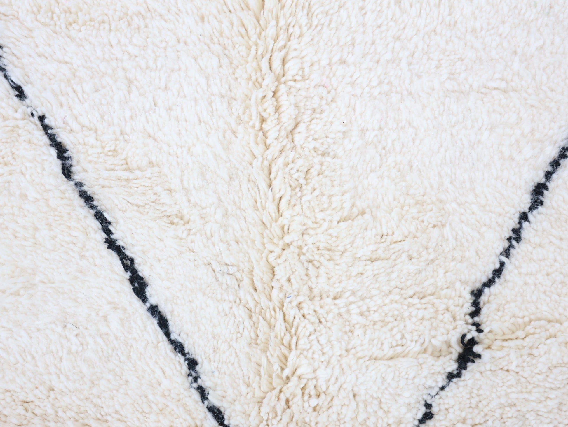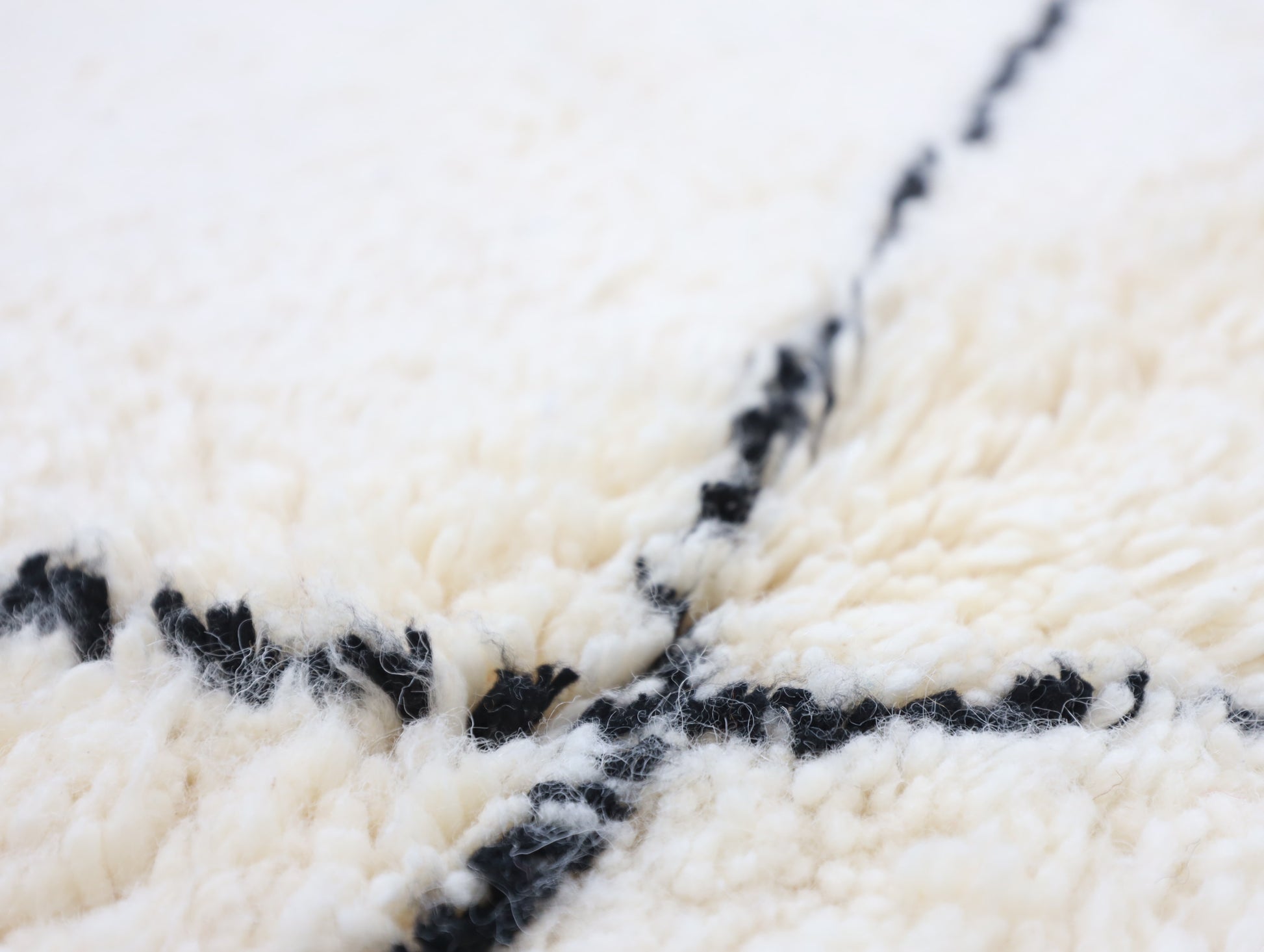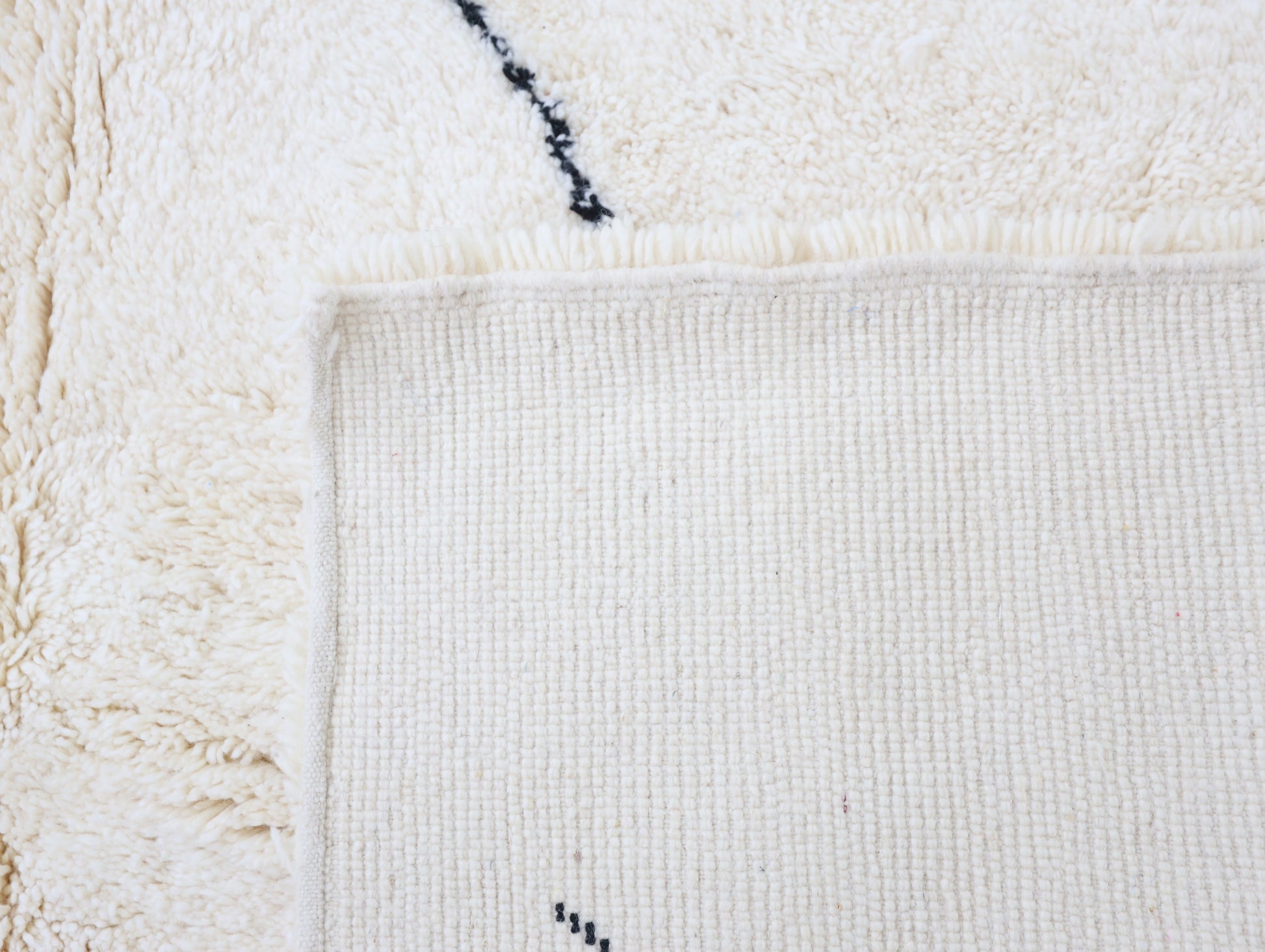 Wool, a sacred material for the Amazigh (Berber) people, forms the cornerstone of Moroccan rug design. Durable, long-lasting, and soft underfoot, wool is both functional and comfortable. In this piece, the wool pile is expertly knotted onto a wool foundation, adding substance and allowing it to gracefully embrace the floor.