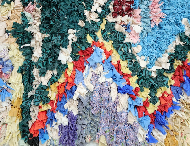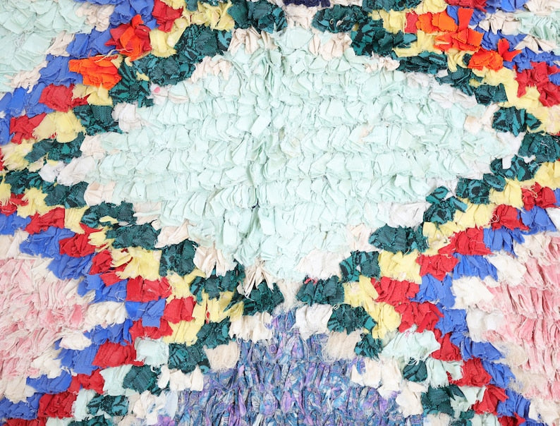 An unparalleled vintage masterpiece, carefully crafted by Berber Tribes in the Boucherouite style using Upcycled Wool textiles.