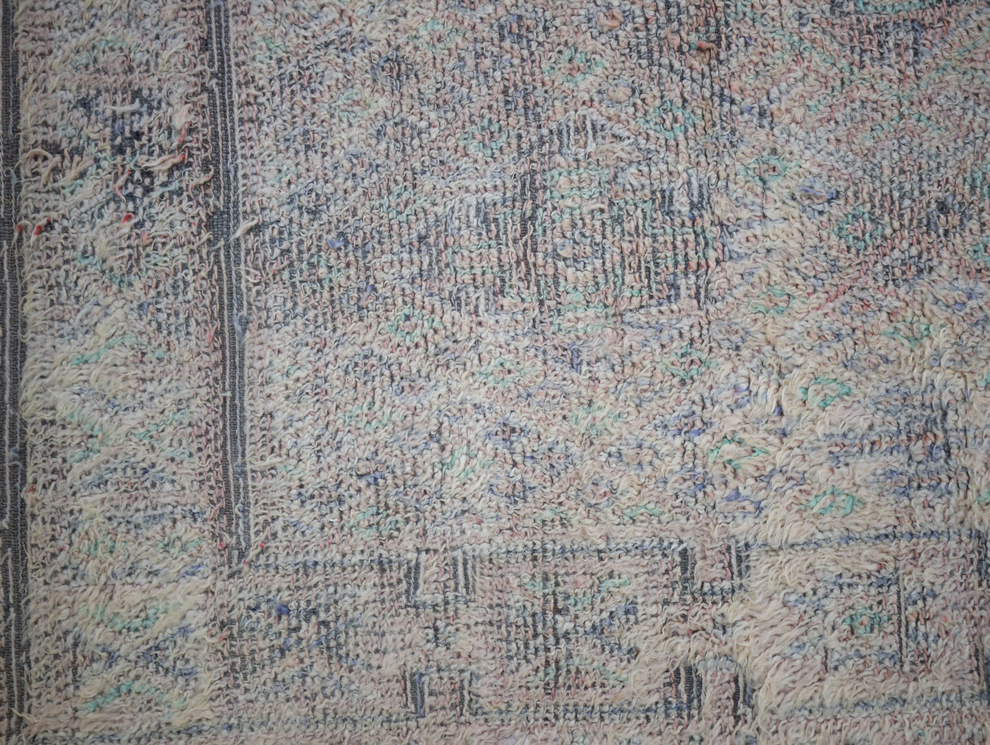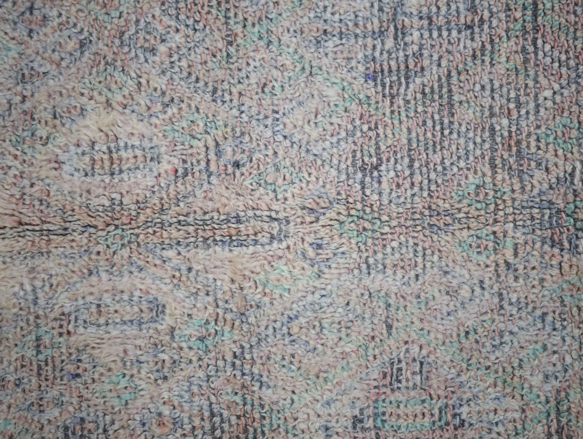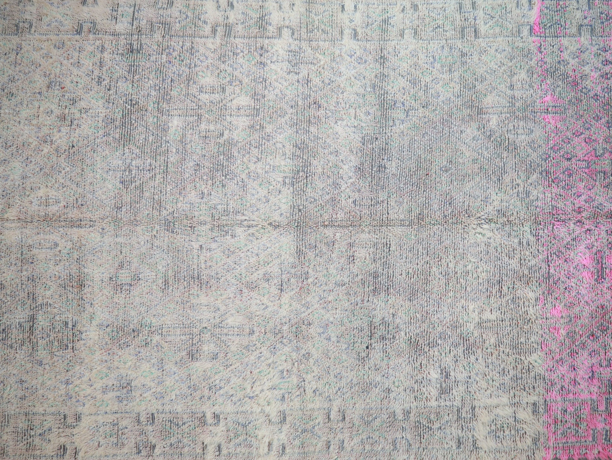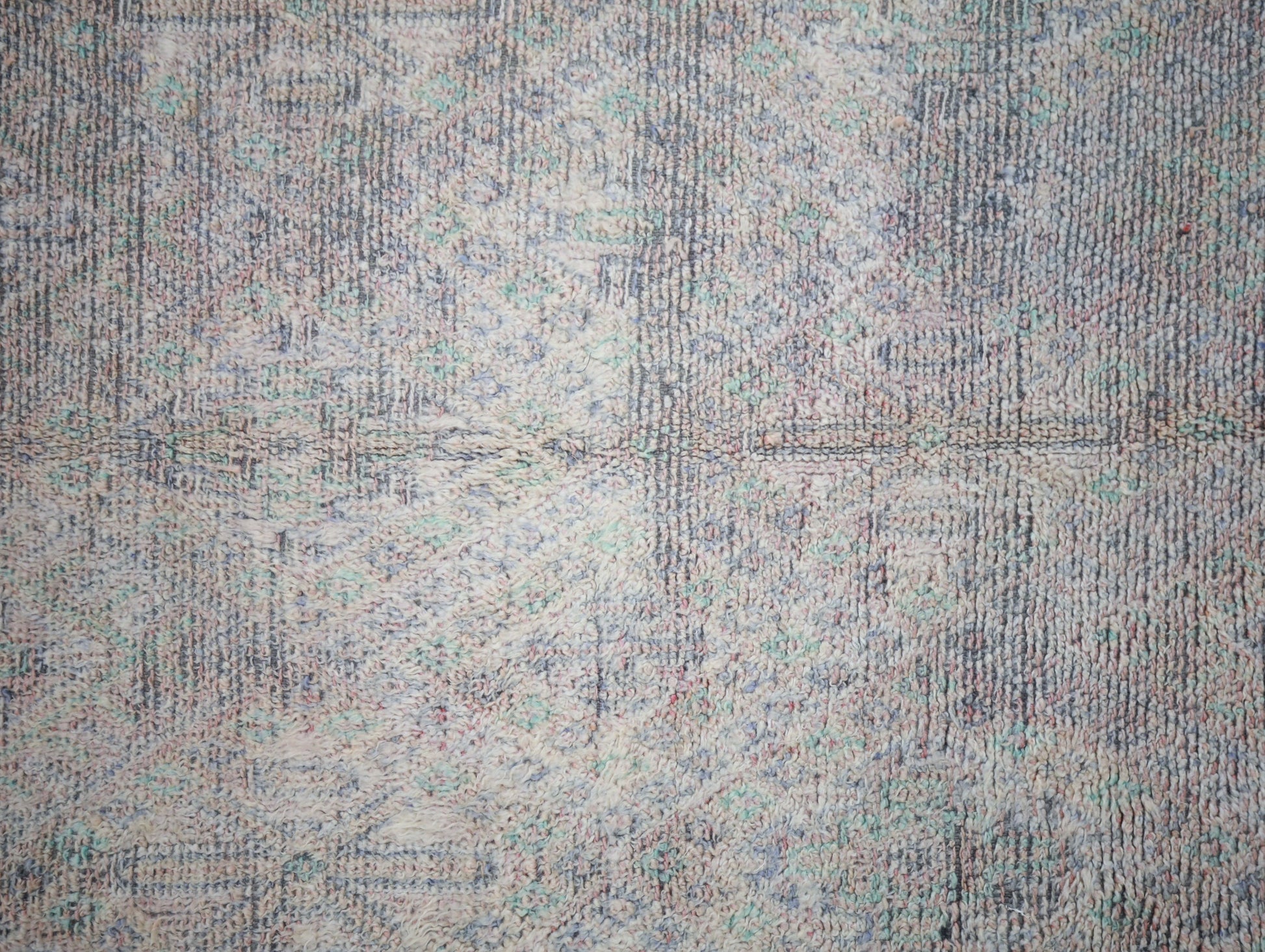 Originating in the Holy town of Boujad, these rugs, woven by diverse tribes, exhibit a wide spectrum of color, composition, and weave. Described as surreal, mystic, and mesmerizing, Boujad rugs transport us to a world beyond reality. Their construction, with twice as many horizontal as vertical knots, renders them floppy and easy to move.