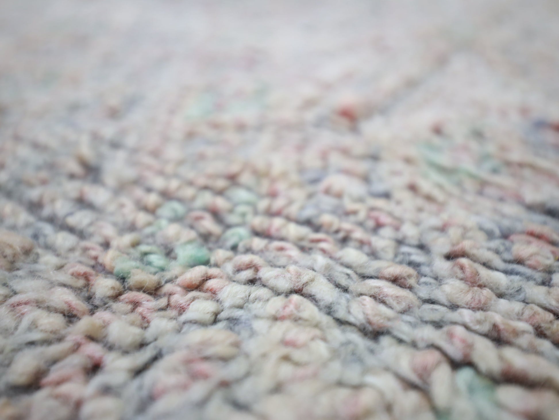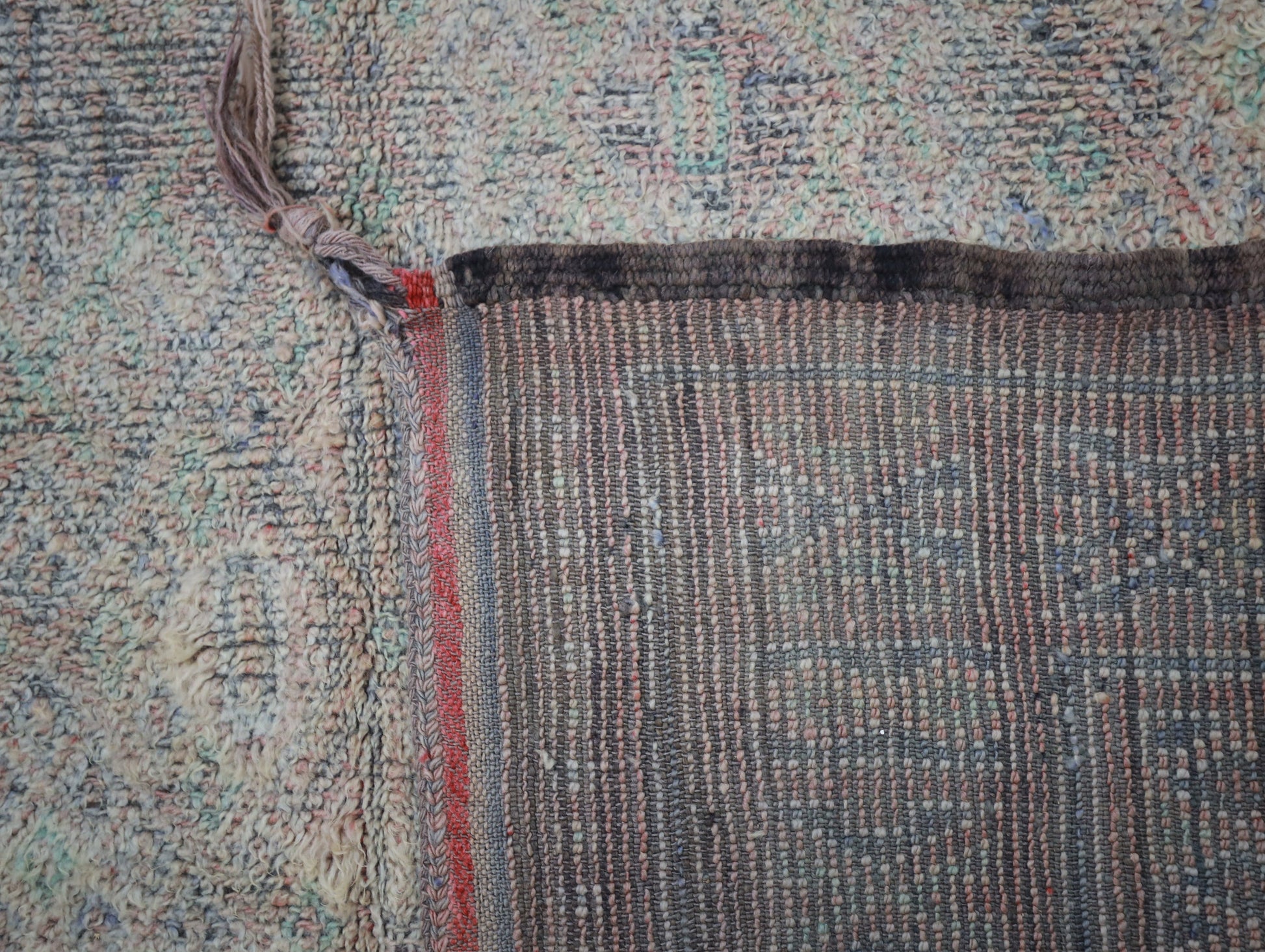 Wool, a sacred material for the Amazigh (Berber) people, forms the cornerstone of Moroccan rug design. Durable, long-lasting, and soft underfoot, wool is both functional and comfortable. In this piece, the wool pile is expertly knotted onto a wool foundation, adding substance and allowing it to gracefully embrace the floor.