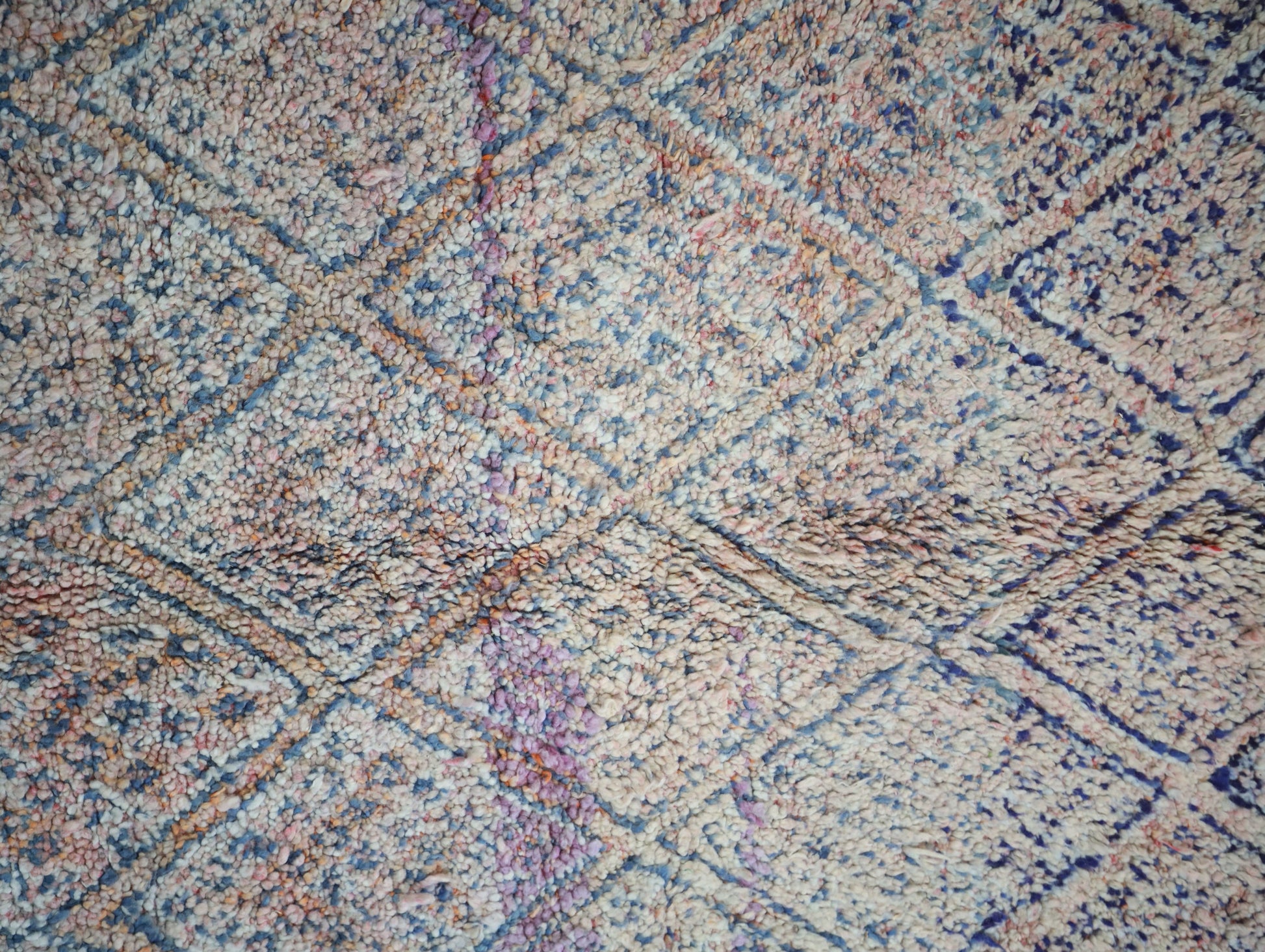 Originating in the Holy town of Boujad, these rugs, woven by diverse tribes, exhibit a wide spectrum of color, composition, and weave. Described as surreal, mystic, and mesmerizing, Boujad rugs transport us to a world beyond reality. Their construction, with twice as many horizontal as vertical knots, renders them floppy and easy to move.