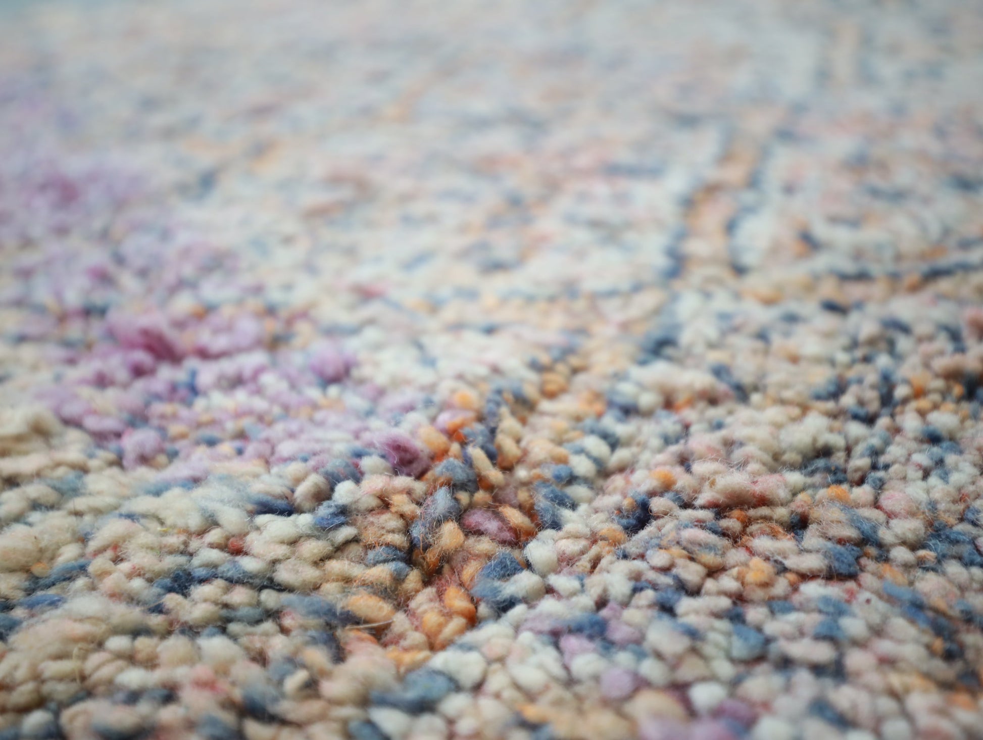Wool, a sacred material for the Amazigh (Berber) people, forms the cornerstone of Moroccan rug design. Durable, long-lasting, and soft underfoot, wool is both functional and comfortable. In this piece, the wool pile is expertly knotted onto a wool foundation, adding substance and allowing it to gracefully embrace the floor.